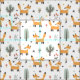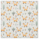 Uma raposa-de-ouro feliz é a característica deste tecido giro. Junto com as imagens da raposa estão as árvores e as flores da floresta. Tudo é colocado sobre um fundo branco.