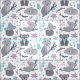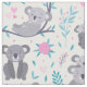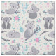 Este tecido adorável apresenta uma variedade de imagens bonitinhas de cinzas koala em várias poses. Junto com as imagens dos ursos estão flores rosa e folhas de cereais. As imagens são colocadas sobre um fundo branco. Bonita para crianças e adultos!