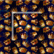 Várias coroas douradas com gemas sobre fundo embelezado azul e preto, padrão de repetição contínua