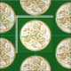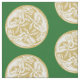 Trío intrincado de cães celtas dourados e brancos em padrão circular sobre fundo verde