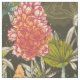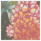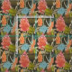 Um padrão botânico abstrato africano em tons de laranja, vermelho, azul e verde sobre fundo escuro.
