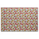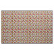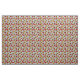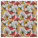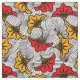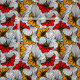 Tecido tradicional africano com formato padronizado, com flores de biloba vermelha e dourada sobre fundo geométrico preto e branco