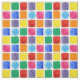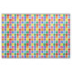 Um tecido colorido, decorado com um padrão geométrico de quadrados e círculos num arco-íris de cores primárias, incluindo vermelho, verde, laranja, amarelo, azul, roxo e rosa pintado com aquarela.