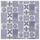 tecido azul-boho e branco-patchwork, modelado com frascos-gengibre, girassóis, pulgas-de-la e azulejos-de-gengibre-marroquinos.