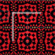 Padrão geométrico decorativo sem costura, com formas geométricas pretas e laranja sobre fundo vermelho.