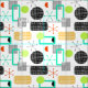 Um design moderno moderno e limpo, moderno e moderno, inspirado em padrões de meio século retrorreflectores em tons de tendência de verde, laranja, amarelo, azul, preto e branco. Padrão fabuloso de pop de cores.