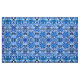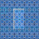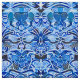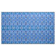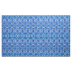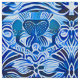 Tecido num padrão batik de formas repetidas, com tema inspirado tribal, em tons de índigo e azul-céu, num fundo branco