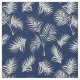 Tecido tropical apresentando um padrão de folhas brancas de palma em um fundo azul-da-noite.