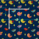 Tecido com um padrão de aves brancas desenhadas à mão. Pinheiros verdes e bonitos entre eles. Fundo azul escuro.