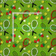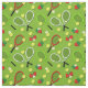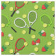 Tecido com modelo desportivo, com raquetes de tênis, bolas de tênis e morangos de Verão sobre fundo verde-grama