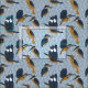 Esse tecido padronizado é perfeito para costurar presentes para amantes de aves. Apresenta ilustrações de pescadores-rei em azul, ouro-mostarda e conjunto branco contra um fundo azul-claro-padronizado.