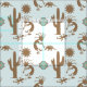 Diversão padrão sudoeste com Kokopelli tocando flauta, cacto, lagartos e tatu sob um sol estilizado. Fundo Aqua Blue. A design faz parte da coleção de Pastéis Sudoeste. As visualizações principais não refletem a cor real (a cor parece esmaecida nelas). Para obter uma visão mais precisa dessa cor de design, clique na opção final, a visualização do azulejo.