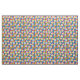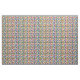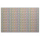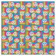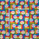 Este tecido tem um design de quadrados feitos de retângulos em cores brilhantes da década de 1970 com sinais de paz espalhados ao seu redor.