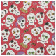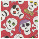 Estes crânios têm um pouco de medo e muito fofinho! Um pirata, um crânio assustado por uma aranha, ossos cruzados, milho doce, e olhos coloridos compõem o padrão neste tecido vermelho do Halloween. Arte original © Anne Coffey.