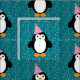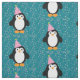 Pinguim de desenho animado bonito vestindo um chapéu de festa com tecido de fundo de padrão confetti.