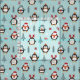 Este tecido de Natal giro apresenta um padrão de pinguins brancos vestindo chapéus vermelhos sobre um fundo de azul aqua com flocos de neve e pinheiros simples. Use para projetos de roupa ou artesanato de férias. De nossos corações aos seus, Felizes Feriados!