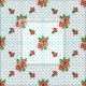 Aglomerados de rosas cor-de-pêssego e roseiras cor-de-rosa pastel em uma diagonal com fundo de bolinhas azul-claro.