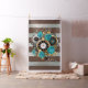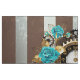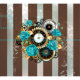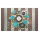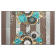 Relógio antigo e patenteado, adornado com joias, mãos de ouro e algarismos latinos com rosa de turquesa sobre fundo castanho e listrado. Estilo Steampunk.