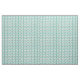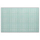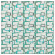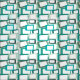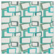 Este tecido tem um design moderno do século médio de retângulos inclinados com buracos brancos em tons de azul-esverdeado.