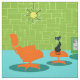 Diz-se que os cães têm proprietários e os gatos têm funcionarios. O felino neste tecido retro do gatinho da era espacial não podia concordar mais! O estilo dos anos 60, características de design minimalistas da arte um gato lustroso, preto em uma sala de visitas moderna do meio século. A sala sofisticada caracteriza proeminente um verde, parede de pedra. O tapete é aqua com sombras da cerceta. O mobiliário da sala inclui um amarelo, uma figura clara de sputnik, uma cadeira de sala de estar alaranjada com footstool de harmonização e uma televisão verde com orelhas de coelho. O gato preto afortunado pode ser visto empoleirou-se no footstool na frente da televisão. Sua mostra favorita está ligada! Na tela da televisão, nós podemos ver uma família preto e branco, clássica da televisão que resolve todos os problemas da vida em uma mostra maia hora. Este design é purrrfect, se nós dizemos assim nós.