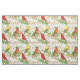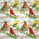 Um tecido bonito decorado com cardeais, robins e pontos de ouro desenhados à mão com tinta e pintados com aquarela com flores delicadas em uma fruta florescente. Adorável pelo decoro doméstico e qualquer um que ama pássaros!