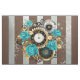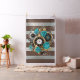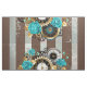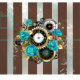 Relógio antigo e padronizado, adornado com joias, mãos de ouro e algarismos latinos com rosas de turquesa sobre fundo castanho e listrado. Estilo Steampunk.