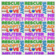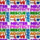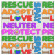 Palavras coloridas de resgate animal, "sarar, castrar, adotar, proteger, resgatar e amar", com patas e gráficos de ossos para cães.