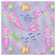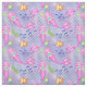 Um tecido de sereia muito fofo, com adoráveis sereias com cabelo cor-de-rosa e escalas cor-de-rosa, nadando sob o oceano com escolas de peixes, peixes palhaços laranja e branco listrados, pequenos peixes amarelos e azuis e algas flutuantes. Tudo sobre um fundo pastel roxo/azul de escamas de peixe.