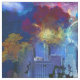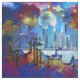 SlipperyJoe NYC grafite lua cercada por redemoinhos nuvens dramáticas céu gradientes de cores intensas paisagem urbana surreal vívida realismo fantasia arranha-céus edifícios mistura rugosidade urbana artística cósmica fundo sonhador presentes orgulho gay LGBTQIA azuis vermelhos ígneos roxos amarelos narrativa sonhadora quase ficção científica tons quentes e frios drama energia