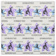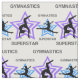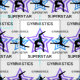 Tecido super-estrela da ginástica feminina. Tem estrelas roxas e azuis por toda parte com silhueta de ginasta dando um salto e uma volta.