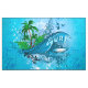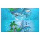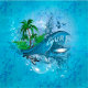 Surfar, prancha com pássaros da palma, azul, bolhas, divertimento, palma, esporte, esporte do verão, surfando, árvore, água