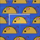 Este padrão de taco giro está se entupindo com queijo, alface e tomate em um fundo azul.