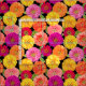 Os zinnias bonito do jardim neste tecido floral estão florescendo nas máscaras de cor-de-rosa, de roxo, de alaranjado, de amarelo e no vermelho em um fundo preto. Aperfeiçoe para qualquer um que ama flores! Projetado pelo artista mundialmente famoso Tim Coffey.