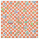 Um desenho do teste padrão dos budgies no estilo bonito do manga com teste padrão alaranjado do verificador para o fundo. Caracterizando muitas cores da mutação do budgie: verde, amarelo, branco, azul, violeta e malva.