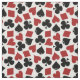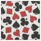 Este tecido inspirado póquer do artesanato tem um teste padrão sem emenda feito de ternos da plataforma de cartão do jogo. As pás, os trevos, os corações e os diamantes couberam junto em preto e no vermelho em um fundo branco. Este tecido olhará grande em sua sala de jogo se você ama algum tipo de jogo de cartas, do póquer ao euchre, à ponte, ao whist ou ao vinte-e-um.