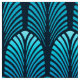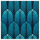 Tecido em um teste padrão do papel de parede do art deco do vintage baseado em uma pena estilizado - máscaras do azul de turquesa/pavão em um fundo escuro do azul do marinho/índigo