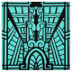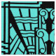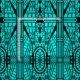 Tecido em um teste padrão baseado em detalhes arquitectónicos do art deco - preto em um fundo de turquesa/pavão