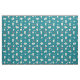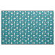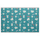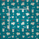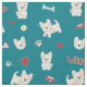 Este tecido moderno para amantes de cachorros apresenta um impressão divertido de franceses bonitos (buldocos franceses) com pegadas e ossos de cachorros, corações vermelhos e taças de comida, e bolas de tênis amarelas sobre um fundo de turquesa escuro.