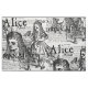 Esta design tem uma colagem de ilustrações pretas e brancas e textos do livro infantil clássico Alice's Adventures In Wonderland.