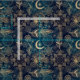 Trendy, modelo floral de caçador de ouro mágico mandala, com uma coleção de penas tribais, flores mandala, flores geométricas, a lua, o sol e as estrelas, círculos, pontos, quadrados, triângulos, chevron zigzag, formas geométricas, uma mandala com um olho de proteção, feita com dourado amarelo e pontos prateados brilhando brilho místico, um plano de fundo azul escuro, azul escuro, verde forte brilhando. Esta trendy, mística, tribal, moda, ilustração de fantasia, design boêmica, é perfeita para o veste diário, decoração caseira, celebrações e decorações de temas de dias especiais.