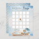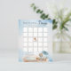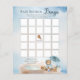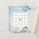 É um garoto e podemos esperar o design do jogo de texto do Chá de fraldas "Bingo" do de espera com um ursinho bonito vestido com uma capa de chuva azul com um guarda-chuva azul. Ele está sentado ao lado de uma poça d'água brincando com seus blocos de madeira entre as sementes, gramíneas e cogumelos. Design composto por Designs Holiday Hearts.
