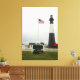 Fotografia do farol Tybee (localizado na Ilha Tybee, fora de Savannah, Geórgia) com o sinal da Estação do Farol de Tybee Island e a bandeira americana em uma tela