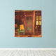 Tela de pintura de óleo de varanda de cabine russa, impressa de uma cabana castanha bem vestida, ao lado de conselhos marrons antigos. Conselho velho e torto, ajudando a segurar o telhado da varanda e a velha cadeira vestida de balanço, com 2 gatos no assento e cobertor dobrado nas costas. Mostra a porta frontal com a porta do ecrã e a janela com cortinas de rendas. Flores plantadas em suportes. Placas de madeira no chão da varanda e lâmpada pendura do cabo. Muito country e cena de casa.