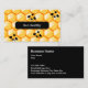 Cartões de visitas temáticos de mel de abelhas com um padrão gráfico de colmeia no fundo e abelhas na frente com os detalhes de contato no verso. Funciona como cartão de visita para apicultor, serviços de controlo de pragas para remoção de abelhas ou produtos relacionados com mel.
