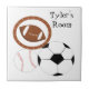 Um legal design com uma bola de couro marrom num círculo castanho, uma bola de baseball com costura vermelha e uma bola de futebol preto e branco. Personalizar com o nome conforme desejado.