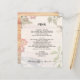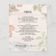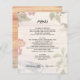 Um modelo de cardápio de casamento com imagens da natureza. O tema do casamento Boho / Bohemian é o design para este menu personalizado. Folhas, flores, penas, bagas e um pássaro formam a fronteira sobre um fundo leve de conselho de madeira. Em maiúsculas, o texto impresso é fácil de personalizar com os aperitivos de menu, o curso principal ou buffet e sobremesas. Coloque os nomes do novo casal e da data do casamento no fundo. O reverso tem uma imagem de conselho de madeira.