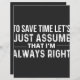 para economizar tempo, vamos assumir que ele está sempre certo, para poupar algum tempo, vamos supor que, ele está sempre certo, piada de humor, sarcasmo, futuro gerente bancário, gerentes de banco reformados, eu amo economia, formando, inspiração para o gerente do banco de casa eu sou um policial de casa, eu sou, para poupar tempo, assumir que ele nunca está errado, apenas assumir, poupar tempo, uma vez