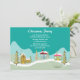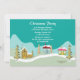 Este convite para a festa de Natal, 5 horas por dia, 7 dias por semana, tem árvores de Natal verdes e algumas casas de bairro cobertas de neve no fundo com suas informações personalizáveis sobre a festa no topo. Design por Riefka Design