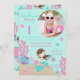 Pequena carta de convite para o primeiro aniversário da sereia com criaturas submarinas e modelo de inserção de fotos.