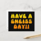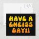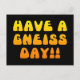 Tenha Um Dia De Gnei! - inscrição amarelo-alaranjada num cartão postal preto.